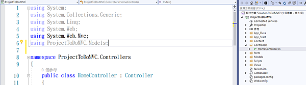 一般我們開啟 MVC 專案的時候,都會建出一個 Controller 目錄。裡面有一個 Controller.cs 的檔案。直接點開它,在畫面中間就可以看到裡面的原始程式。這裡為了使用 Model 裡的資料,在 參考區域 要將 專案裡的 Model 參考進來。語句如下: