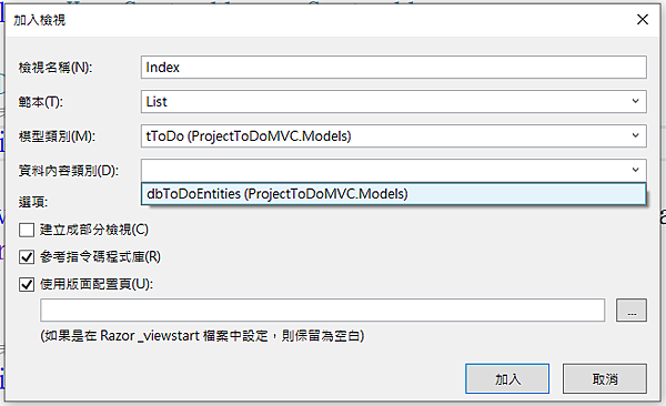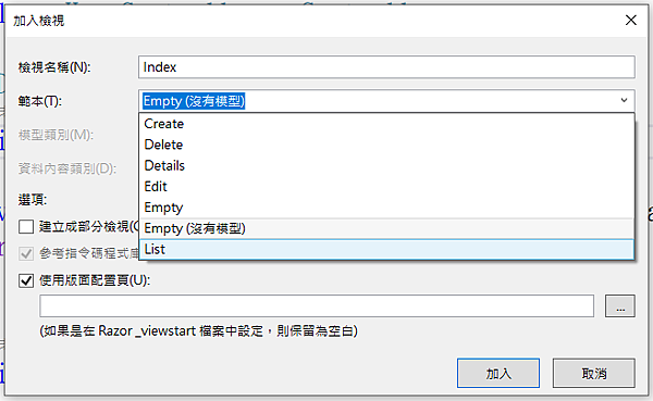 建立 MVC 專案時,通常Views 目錄下的 index.cshtml 檔案已經存在。這裡為了要顯示資料表格裡的內容要用新的內容取代原來的內容。直接按 是(Y) 就可以。